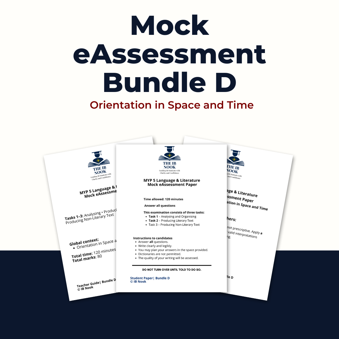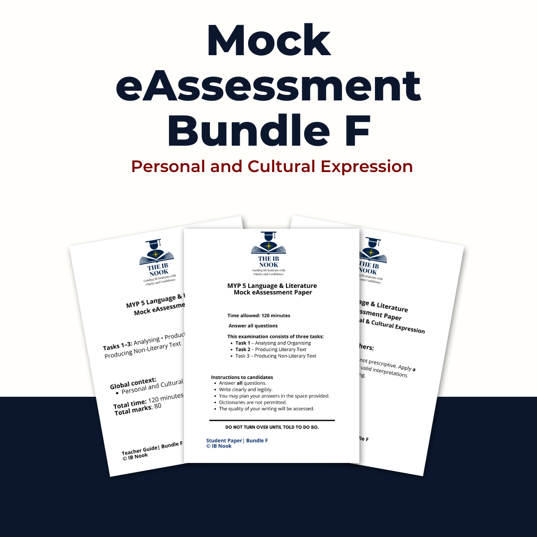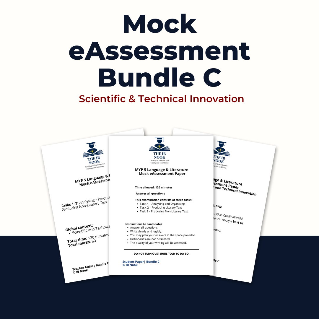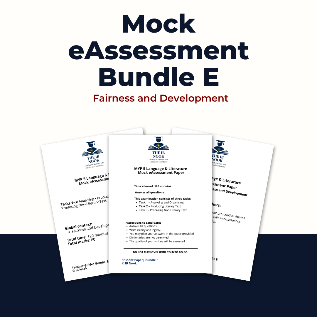 A complete, exam-authentic MYP 5 Language and Literature mock eAssessment designed to mirror the structure, timing, and demands of the official IB assessment. This bundle includes Tasks 1–3, with commercially safe adapted texts, clear marking guidance, a detailed teacher guide, and high-band model responses to support effective teaching, assessment, and exam preparation.