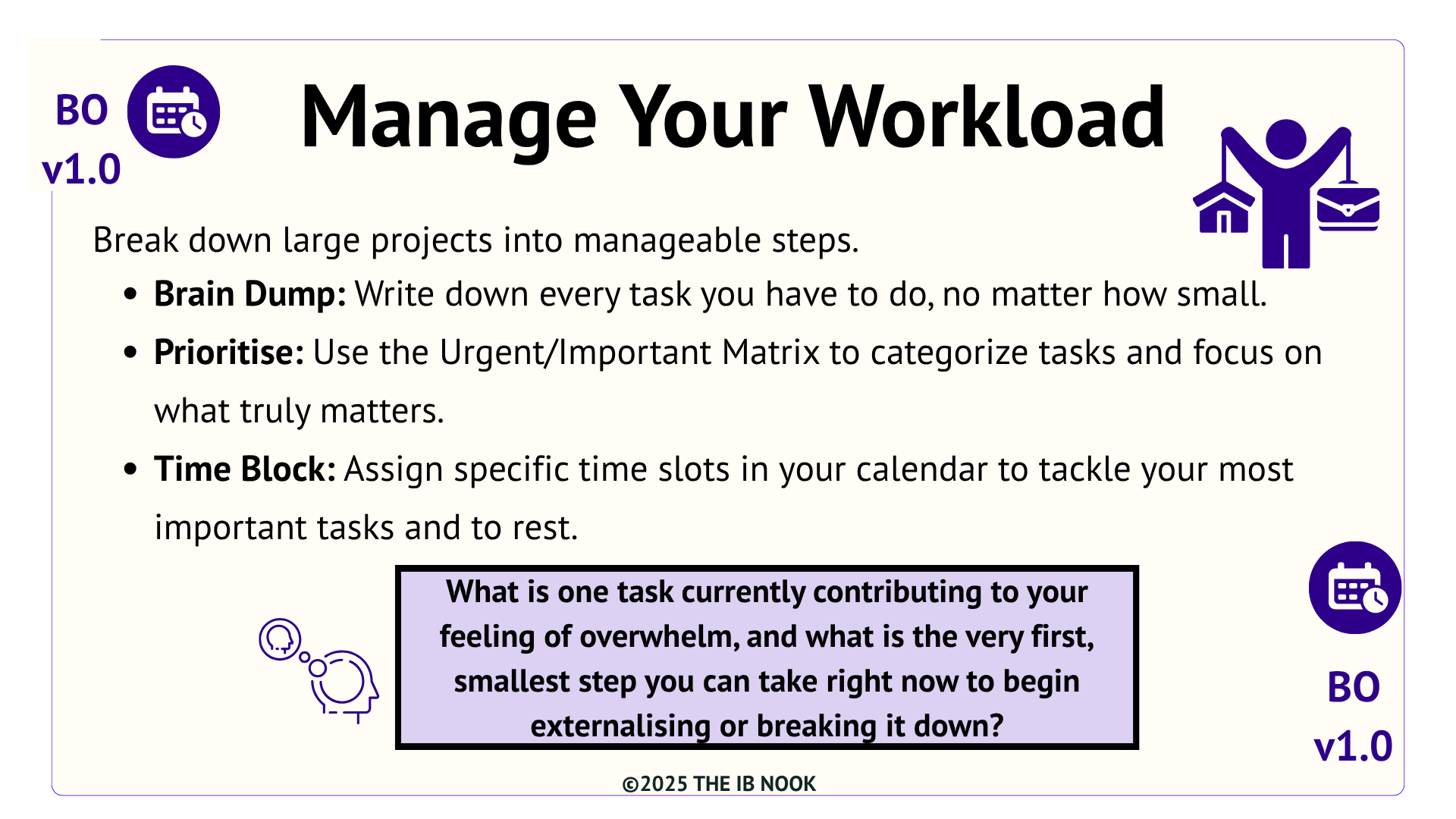 This bonus card introduces a crucial skill for every IB student: managing your workload. The IB Diploma Programme is demanding, and without a clear system for handling deadlines, assignments, and personal commitments, the pressure can feel overwhelming. This lesson will show you how to move from feeling reactive to feeling in control by using proactive planning and smart prioritisation.